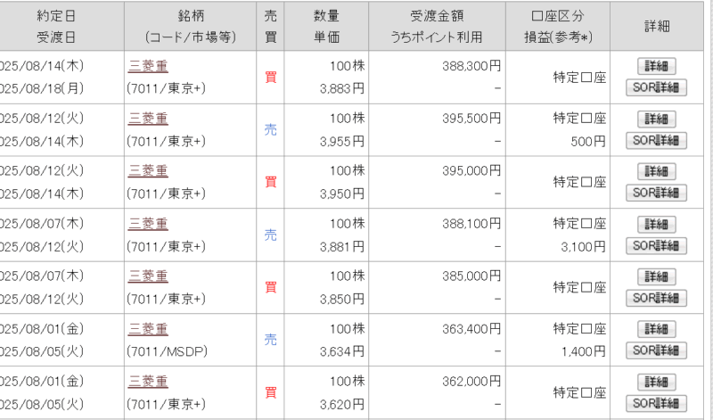 7月末から三菱重工で短期売買をしてみました。